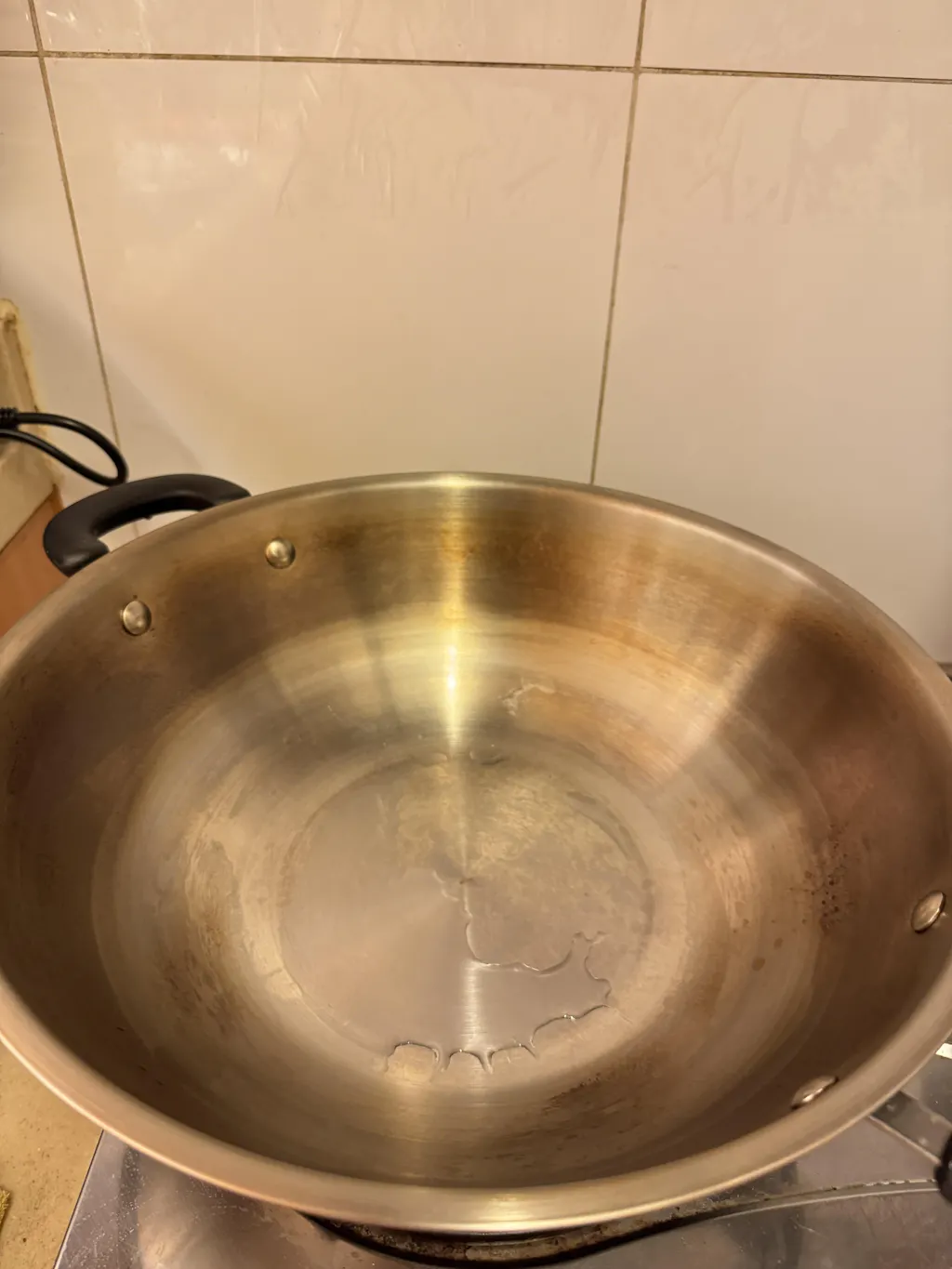 上星期才正式用貴公司出品的不鏽鋼鑊, 當時開了半窩水,開火後不久便出現图中的情況,鍋邊好像生鏽一樣,清洗後也沒法回復過來。